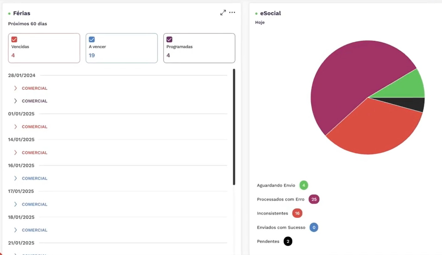 Transforme a gestão do Departamento Pessoal em uma experiência mais estratégica, segura e eficiente com uma solução completa para Folha, Ponto e Painel de Gestão de Pessoal. O módulo Folha automatiza cálculos individuais e coletivos, integra benefícios, férias, afastamentos, cargos e salários, SST, centros de custos, medicina, empréstimos, desoneração, terceiros e pagadoria, assegurando precisão, agilidade e total conformidade com o eSocial. Com qualificação cadastral em lote, auditoria de inconsistências, relatórios detalhados e controle da sequência lógica dos eventos, sua empresa reduz custos operacionais e atende à legislação com facilidade. O módulo Ponto simplifica a apuração e o controle da jornada com rapidez, confiabilidade e operação intuitiva. Já o Painel de Gestão de Pessoal oferece visão em tempo real da folha por competência, comparativos históricos, ocupação por cargo e departamento, turnover, admissões e rescisões, horas extras, absenteísmo e afastamentos. Tudo isso com base criptografada, auditorias automatizadas e integração com os módulos Contábil, Financeiro e GED, para sua empresa crescer com confiança, proteger informações sensíveis e valorizar pessoas com inteligência, controle e excelência.